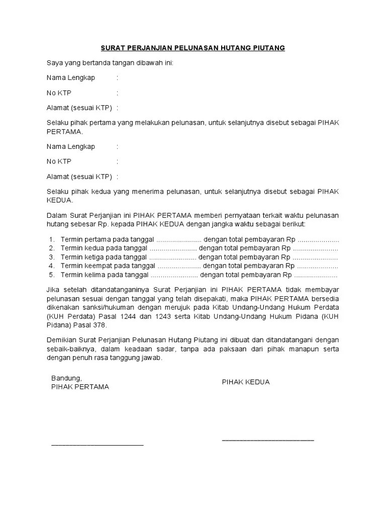Contoh surat perjanjian singkat yang dibahas disini dibuat mengikuti surat perjanjian asli yang sah dan benar. Surat promes biasanya berisi semua persyaratan yang berkaitan dengan hutang, seperti jumlah pokok, tingkat bunga, tanggal jatuh … 18.12.2018 · sebagai referensi, berikut ini akan kami bahas contoh surat perjanjian pembayaran: Data diri sangat penting dalam suatu surat perjanjian utang karena untuk menghindari kesalahan identitas di kemudian hari, sehingga siapa … Pada hari ini, rabu (11 september 2019), kami yang bertanda tangan di bawah ini setuju membuat surat perjanjian hutang piutang, yaitu: Surat pernyataan pelunasan hutang piutang. Surat perjanjian pembayaran ganti rugi; 15 contoh surat perjanjian hutang piutang yang baik dan benar dalam berbagai kasus penggunaan surat perjanjian memang … Bukan tidak mungkin jika pelanggan lupa untuk membayar kewajiban tersebut sehingga anda perlu mengingatkannya dengan mengirimkan surat penagihan … Perjanjian hutang piutang sederhana dengan jaminan bermaterai. Surat perjanjian pembayaran uang muka / dp rumah; Nantinya akan melibatkan kedua belah pihak yang terlibat dalam hutang piutang tersebut. 12.05.2021 · contoh surat perjanjian hutang.